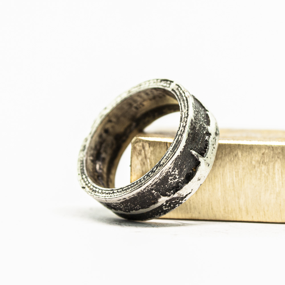 inspired by erosion as seen in the natural landscape. these rings look great by themselves or stacked together. also available in sterling silver 925. finished with a dark patina then polished to reveal the intricate texture.